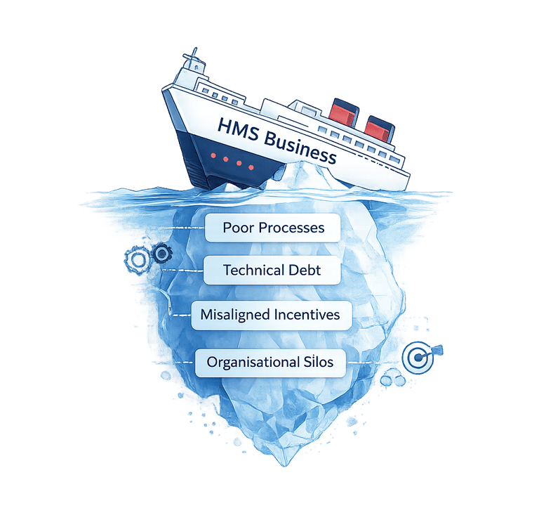 Much like an accident investigation doesn’t blame “the ocean” for a sinking ship, we don’t blame attackers, users, or tools. We examine the specific conditions within your organisation that made failure likely — and repeatable.